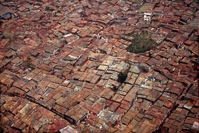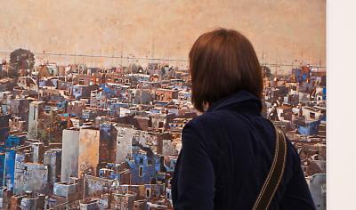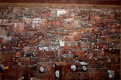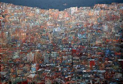 Kilkanaście obrazów przedstawiających z lotu ptaka nieprawdopodobnie zagęszczone, zajmujące olbrzymią przestrzeń przedmieścia, ustawione ciasno obok siebie jednorodzinne domki i przylegające do siebie baraki, las dachów, anten satelitarnych. Mieszkańców nie widać.