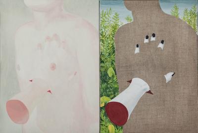 „Dotyk - Pozytyw negatyw", 2012, tempera, olej na płótnie, 40 x 90 cm