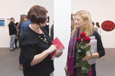 Wernisaż wystawy BIELSKA JESIEŃ 2013, 8 listopada 2013, od lewej Agata Smalcerz - dyrektor Galerii Bielskiej BWA i Grażyna Cybulska - kurator Biennale Wernisaż wystawy BIELSKA JESIEŃ 2013, 8 listopada 2013, na zdjęciu Ewa Juszkiewicz, laureatka Grand Prix