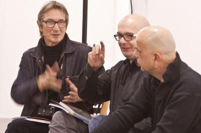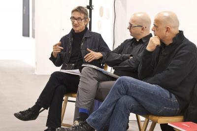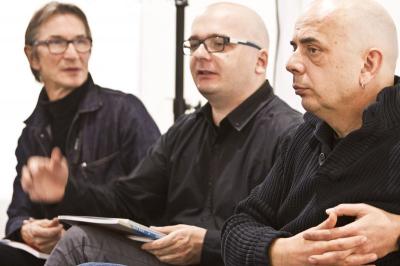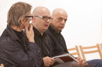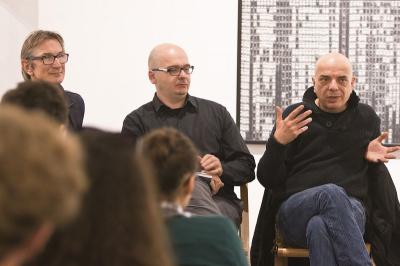Panel dyskusyjny M jak malarstwo, 9 listopada 2013, Galeria Bielska BWA, od lewej Grzegorz Borkowski, Kamil Kuskowski i Paweł Jarodzki