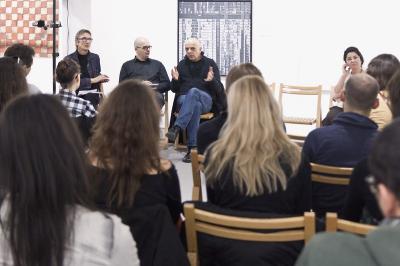 Panel dyskusyjny M jak malarstwo, 9 listopada 2013, Galeria Bielska BWA, na zdjęciu od lewej Grzegorz Borkowski, Kamil Kuskowski i Paweł Jarodzki