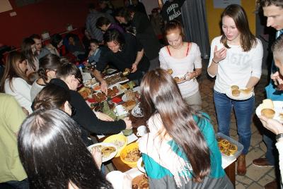 2. Uczestnicy przynoszą przygotowane potrawy, którymi dzielą się z innymi lub - jeśli nie mają czasu na gotowanie - płacą 10 ZŁ i mogą kosztować wszystkich przyniesionych potraw. Gotujący mogą uczestniczyć w spotkaniach BEZPŁATNIE.