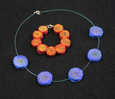 Po zwinięciu wielokolorowego filcowego dreda, uczestnicy tną z niego korale i z nich tworzą bransoletę lub naszyjnik.