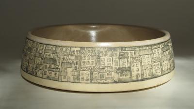 Agata Surdziel, z serii „Miasta”, glina na kole garncarskim, rysunek kredką, temperatura wypału 1320°C