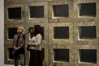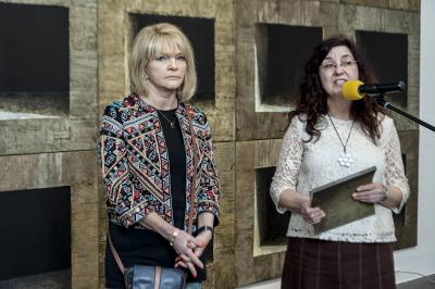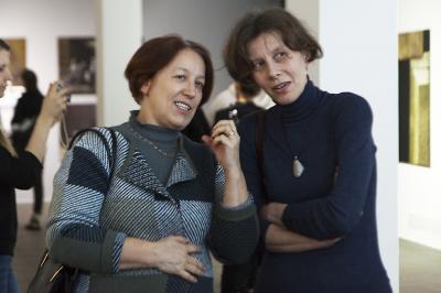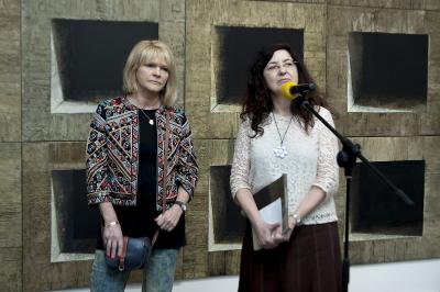 Ewa Zawadzka, MATERIA CISZY, wernisaż wystawy, od lewej Ewa Zawadzka i Agata Smalcerz, dyrektor Galerii Bielskiej BWA