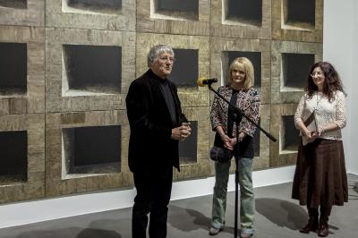Ewa Zawadzka, MATERIA CISZY, wernisaż wystawy, od prawej Ewa Zawadzk, Agata Smalcerz, dyrektor Galerii Bielskiej BWA