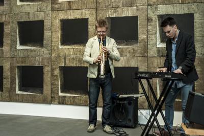 Ewa Zawadzka, MATERIA CISZY, wernisaż wystawy, od lewej muzycy Marcin Żupański i Piotr Matusik