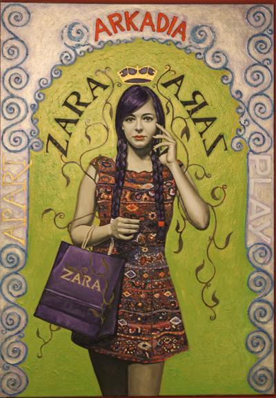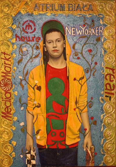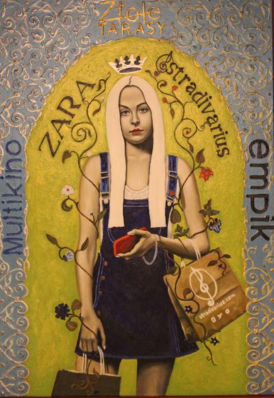 Maluję uchwycone kadry, które przedstawiają realne sytuacje: robienia zakupów, pisania esemesów, posługiwania się smartfonem. Czynności z codziennego życia zamieniają się w coś ponadczasowego, w specyficzny sposób archiwizują rzeczywistość. W poszukiwaniu inspiracji, w czasach zdominowanych przez pop-sztukę, dokonuję regresu w obszary estetyki sarmackiej, średniowiecznej. Próbuję połączyć tradycję regionalną północnego Mazowsza, z nowoczesnością, powiązać nowość Zachodu z estetyką Wschodu, staram się wyłuskać progres poprzez regresywizm. Przepisane na obrazach nazwy marek spełniają kilka funkcji: określają czas, miejsce, trendy w modzie, pokazują wszechobecną reklamę, globalność rynku, a w połączeniu z ornamentami i przesyconym kolorem odzwierciedlają atmosferę galerii handlowej. Ma się wrażenie, że dzisiejsze galerie handlowe to współczesne kościoły, które zamiast życia wiecznego, oferują życie w luksusie i dobrobycie, tu i teraz".