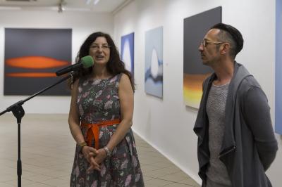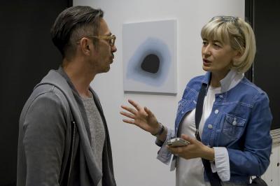 Wernisaż wystawy Artura Trojanowskiego EMANACJE, Agata Smalcerz, dyrektor Galerii Bielskiej BWA i Artur Trojanowski