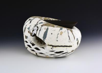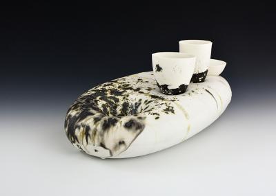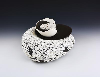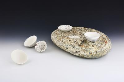 My latest works are massive, oval forms inspired by organic stone shapes into which I integrate delicate porcelain vessels or other functional and semi-functional pieces. The contrast between the coarse primitive textures and delicate civilised forms sets up an elusive tension in my work.