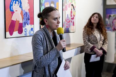 Wernisaż wystawy malarstwa Marty Fonferek, 3 lutego 2017, od lewej Agata Smalcezr, dyrektor Galerii Bielskiej BWA, przy mikrofonie Joanna Brzozowska-Papuga