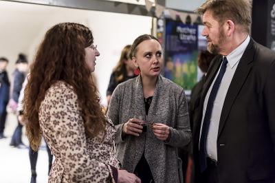 Wernisaż wystawy malarstwa Marty Fonferek, 3 lutego 2017, od lewej Marta Fonferek, Agata Smalcerz, dyrektor Galerii Bielskiej BWA