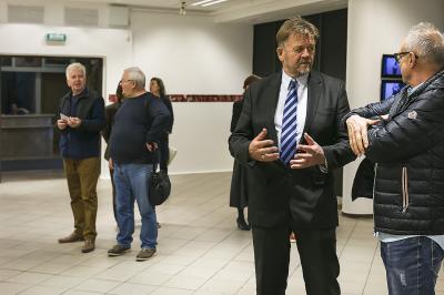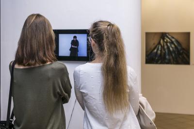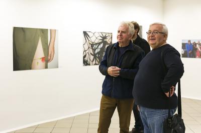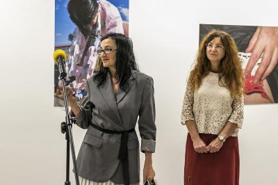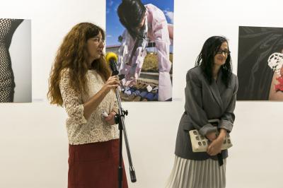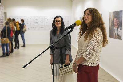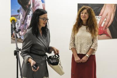Wernisaż wystawy Ewy Swidzińskiej SELFOWAĆ!, od prawej Agata Smalcerz - dyrektor Galerii Bielskiej BWA, artystka Ewa Swidzińska
