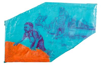 Welcome, 2017, tempera, akryl, lakier do podłóg na pościeli nabitej na krosno, 88 x 132 cm