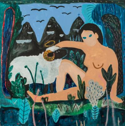 Ja z Barankiem Bożym w Tatrach, 2017, technika mieszana, 140 x 140 cm