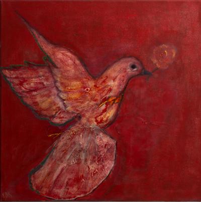 Aby rzetelnie wybrać najlepszy obraz spośród tak wielu dzieł należy oglądnąć wszystkie. Takim tropem poszłam, co sprawiło, że miałam wielki dylemat z wyborem najciekawszego i najlepszego. Okazało się, że na końcu całej galerii miałam tylko jeden naprawdę dobry typ, który zapamiętałam. Niektóre obrazy wzbudziły we mnie odrazę, niektóre podziw, a przekazu niektórych niestety nie zrozumiałam (a może w ogóle go nie miały?). Mój wybór padł na obraz przedstawiający gołębicę, a może gołębia? Nie do końca znając się na rozróżnianiu płci ptaków trochę ciężko mi to jednoznacznie określić. W każdym bądź razie na obraz ten spojrzałam tylko raz i zapamiętałam każdy jego szczegół. Gołębica (przyjmijmy, że to jednak kobieta), która zazwyczaj symbolizuje pokój, miłość oraz nadzieję spowita była w czerwoną kolorystykę, tło obrazu również było czerwone. Przerażająco czerwony kolor kojarzył się ze strasznym, ociekającym krwią światem, gdzie dzieje się wiele złego, a gołębica wyglądała jakby sama właśnie stamtąd uciekała, jakby się ratowała z „piekielnego" miejsca. Jej pierś wygląda, jakby była ranna i krwawiła, a z oczu spływały łzy. W dziobie widać czerwony kwiat. Biblijna gołębica przyniosła Noemu zieloną gałązkę oliwną jako symbol nadziei na znalezienie suchego lądu pośród powodzi. Czym więc miał być czerwony kwiat niesiony przez gołębicę z obrazu? Biorąc pod uwagę pozostałe tytuły dzieł tej autorki odnoszące się do Aleppo zdaje sobie nagle sprawę, że ten biedny ptak jest jednak symbolem nieustającej wiary i nadziei, że koszmar Aleppo kiedyś się skończy, że kiedyś jeszcze ustanie huk pocisków płoszących gołębie...