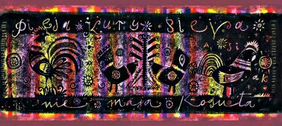 Warsztaty artystyczne z wykorzystaniem szablonów z motywami zaczerpniętymi z tradycji polskiej sztuki ludowej odnoszącej się do Świąt Wielkanocnych: baranka, zajączka, pisanek, a przede wszystkim koguta, tak niezwykle popularnego zwłaszcza w wycinance, prowadzącej wprost do sztuki szablonu. Podczas zajęć powstaną prace w technice kolażu wykonane na dużym formacie. Na kolorowe abstrakcyjne tło uczestnicy warsztatów będą naklejać lub nanosić metodą szablonu, ludowe motywy kojarzące się z symboliką Świąt Wielkanocnych.