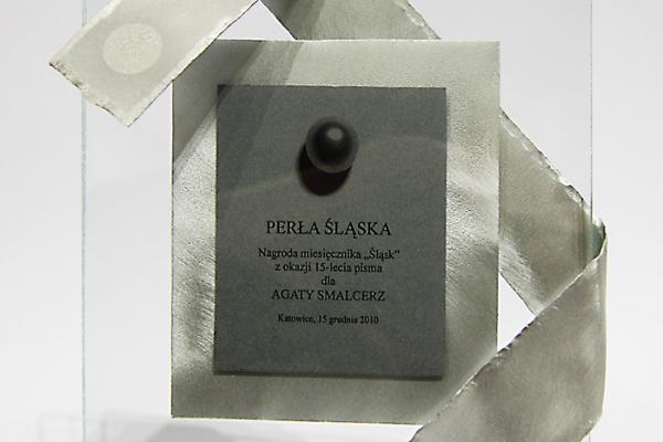 Miesięcznik „Śląsk" obchodzi 15-lecie istnienia i z tej okazji, 15 grudnia 2010 r., w kinoteatrze Rialto w Katowicach, podczas uroczystości jubileuszowych, wręczono nagrody i wyróżnienia za wybitne dokonania dla kultury i promocji Śląska. Miło nam poinformować, że w gronie wybitnych postaci nagrodzonych „Perłą Śląska" znalazła się także Agata Smalcerz - dyrektor Galerii Bielskiej BWA.